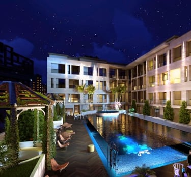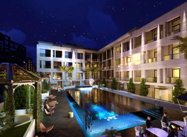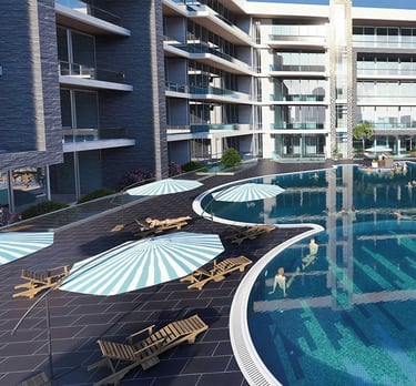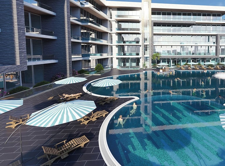 Facilități tip resort: piscină infinity, fitness, spa, zone verzi, locuri de joacă.