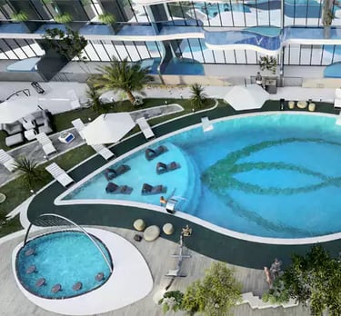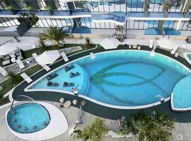 Piscină tip infinity, sală de fitness, spa, cinema pe acoperiș, lounge și zone de joacă.