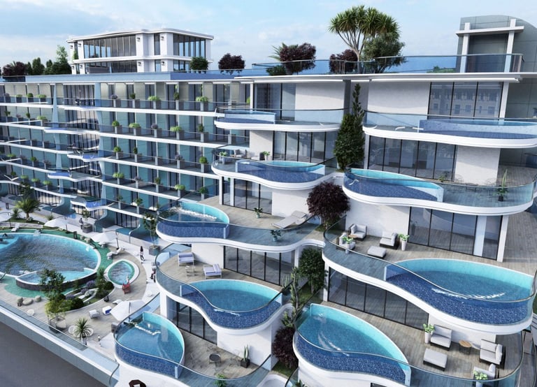 Studio, 1 și 2 dormitoare, unele cu piscină privată pe balcon.